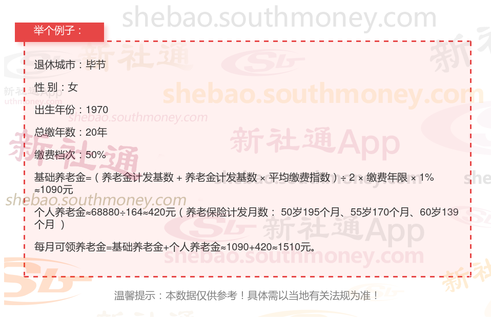 退休城市:毕节,性别:女,出生年份:1970,总缴年数20年,缴费档次:50%