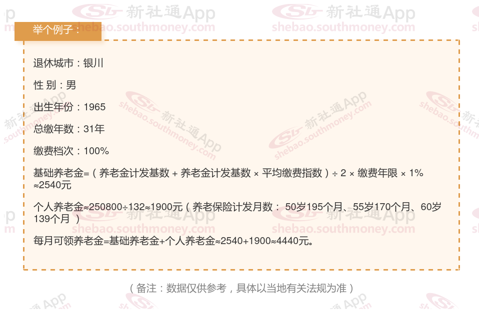 退休城市:银川,性别:男,出生年份:1965,总缴年数31年,缴费档次:100%,新社通app养老金计算器所得: