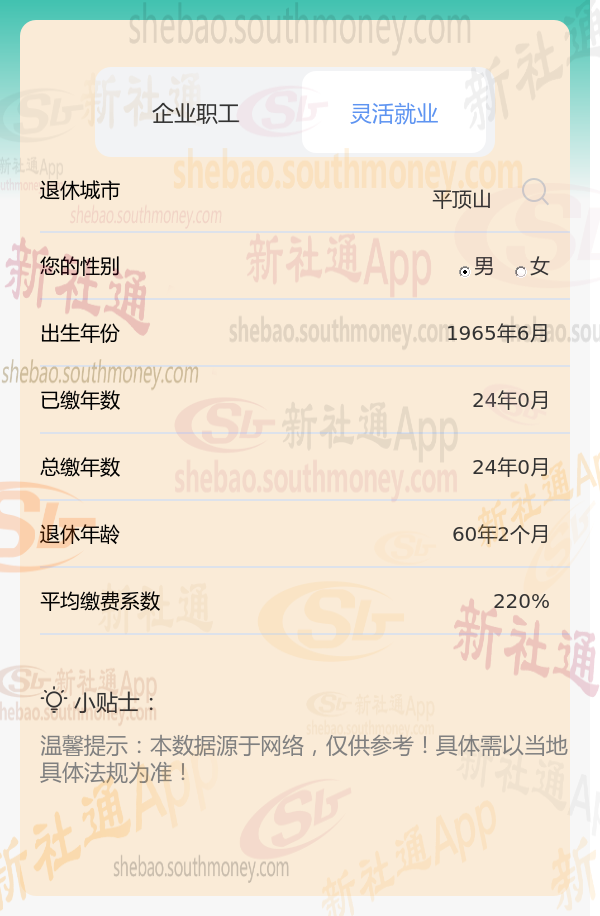 退休城市:河南平顶山,性别:男,出生年份:1965,总缴年数24年,缴费档次:220%为例,新社通app养老金计算器预设工资增长率等参数为3%。在此情境下,其退休后能领取的养老金数额需通过计算器精确得出,但基于上述条件,预计数额会相对较低。为获准确估算,建议朱某使用计算工具按要求输入个人信息进行计算,具体数额依个人情况及当地法规而定。