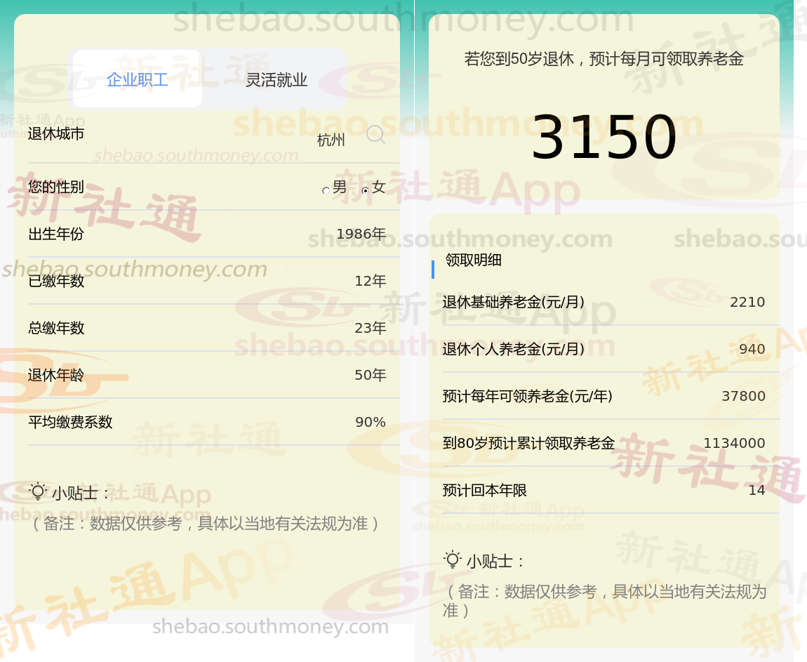 通过新社通APP-养老金计算所得:退休城市、出生年份、退休年龄、缴费系数都相同的情况下,社保缴费年限累计20年时,计算如下: