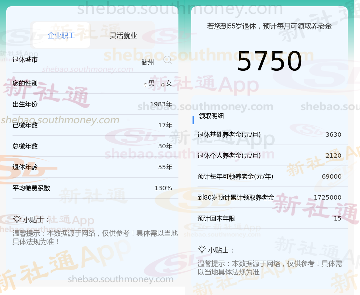 通过新社通APP-养老金计算所得:退休城市、出生年份、退休年龄、缴费系数都相同的情况下,社保缴费年限累计30年时,计算如下:
