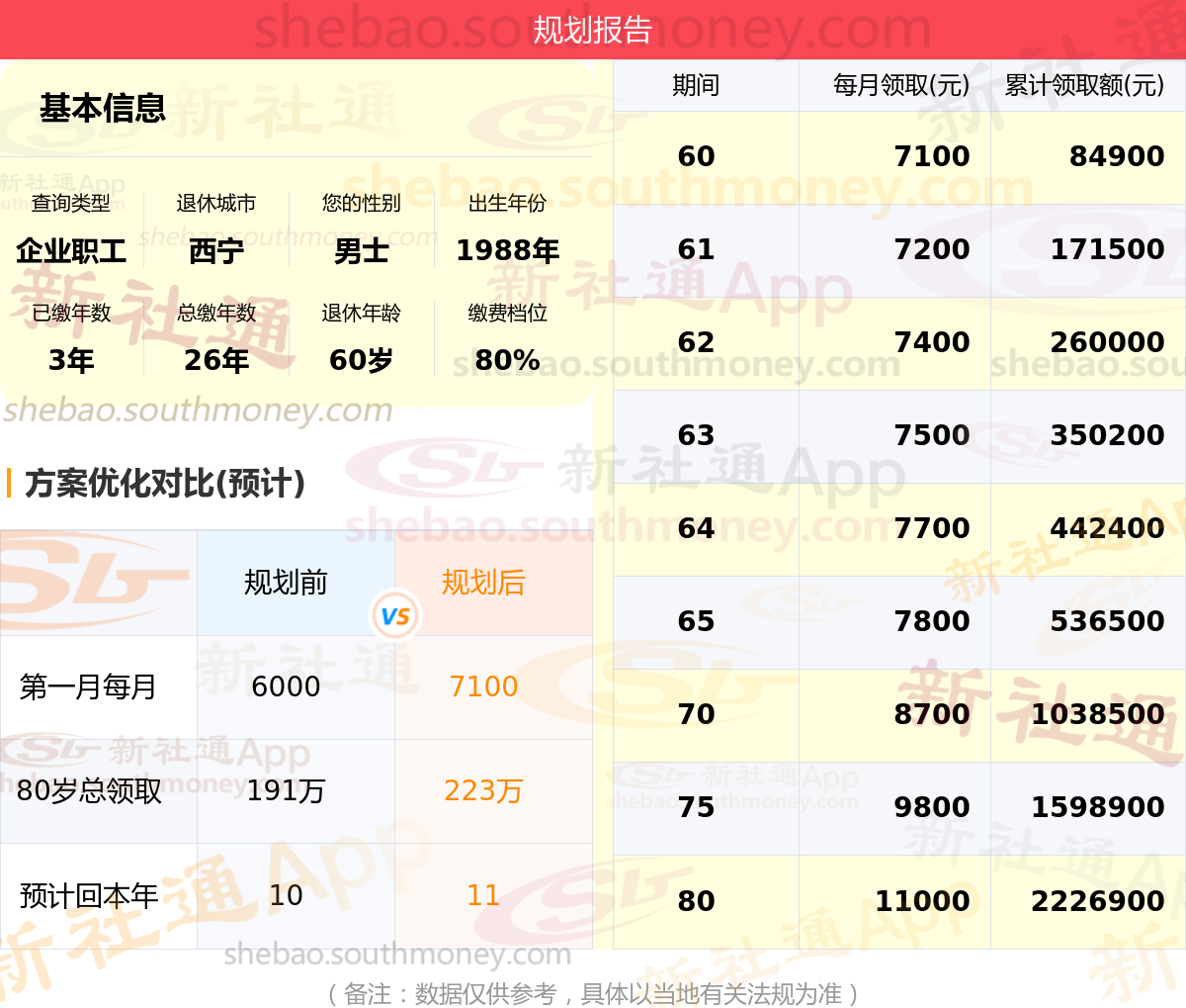 规划前:60岁第一个月约领6000元,新社通APP-养老金规划后:60岁第一个月约领7100元