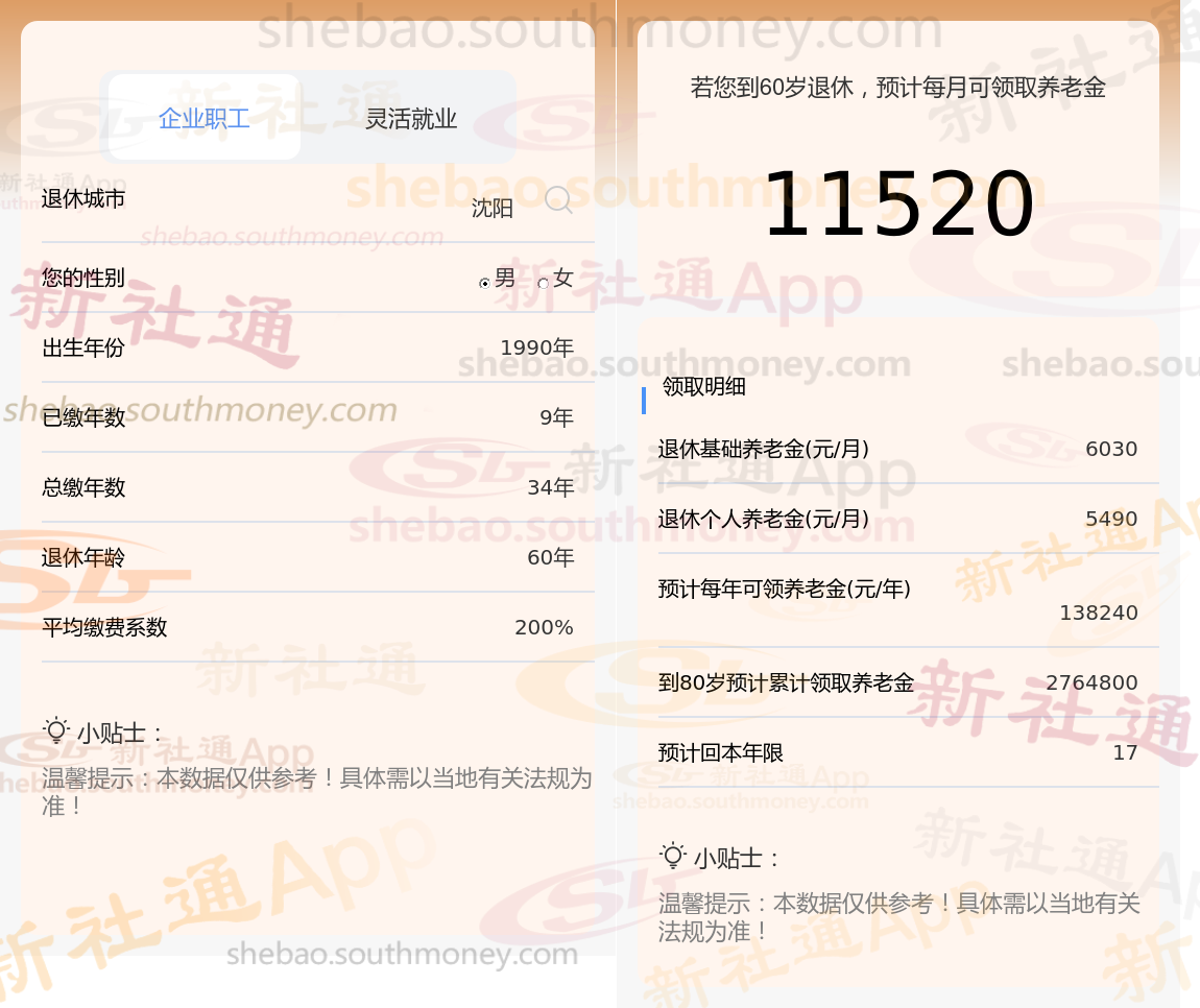 通过新社通APP-养老金计算所得:退休城市、出生年份、退休年龄、缴费系数都相同的情况下,社保缴费年限累计34年时,计算如下: