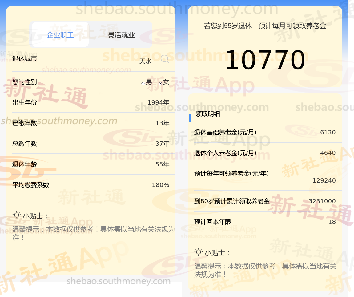 通过新社通APP-养老金计算所得:退休城市、出生年份、退休年龄、缴费系数都相同的情况下,社保缴费年限累计37年时,计算如下: