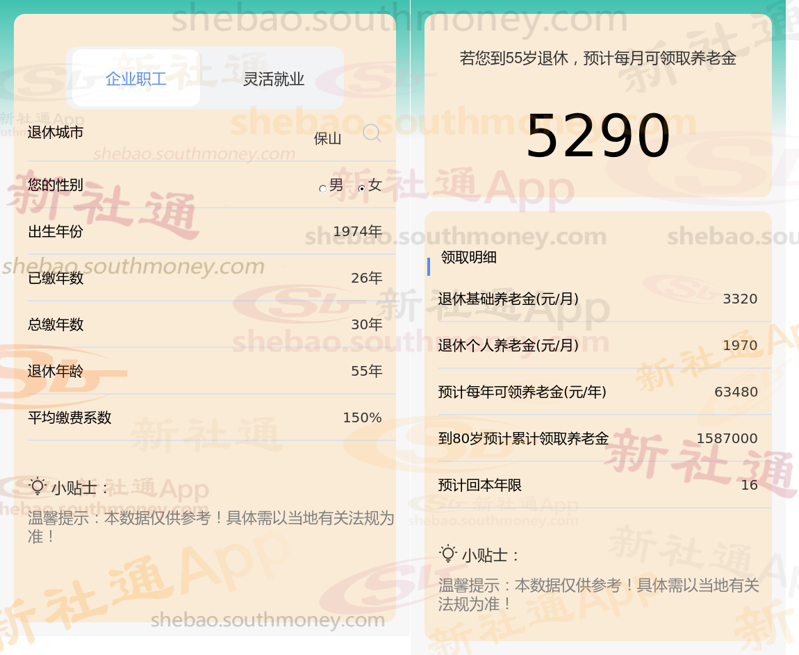 通过新社通APP-养老金计算所得:退休城市、出生年份、退休年龄、缴费系数都相同的情况下,社保缴费年限累计30年时,计算如下: