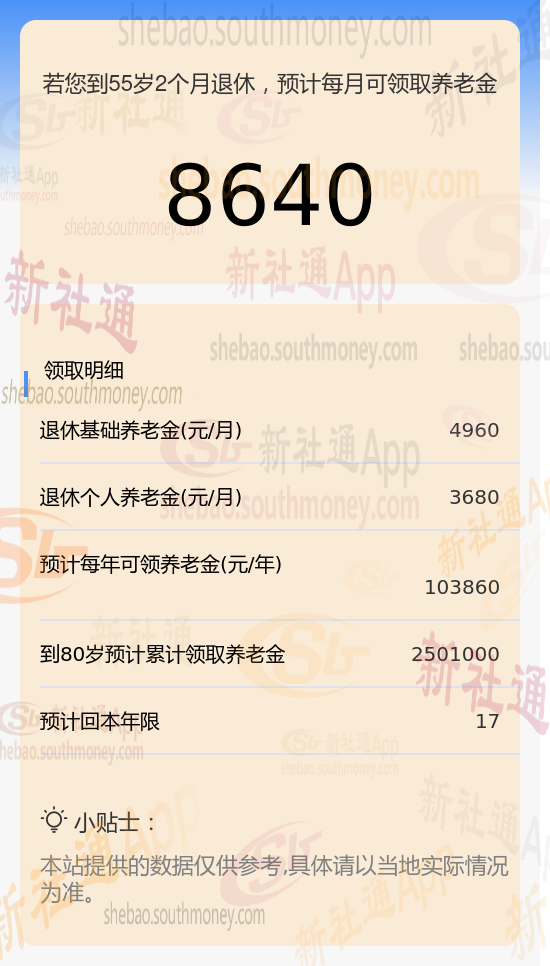 柯某,作为一位勤勉的职工,他的养老保险缴纳记录长达29年之久,且缴费档次一直保持在较高的290%水平。基于这些关键数据,我们利用新社通app养老金计算器,结合最新的养老保险法规,对其养老金进行了如下估算: