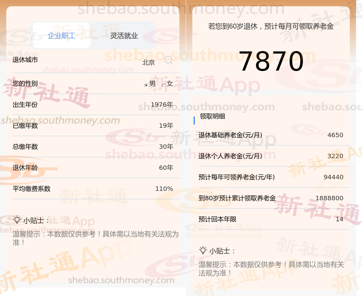 通过新社通APP-养老金计算所得:退休城市、出生年份、退休年龄、缴费系数都相同的情况下,社保缴费年限累计30年时,计算如下: