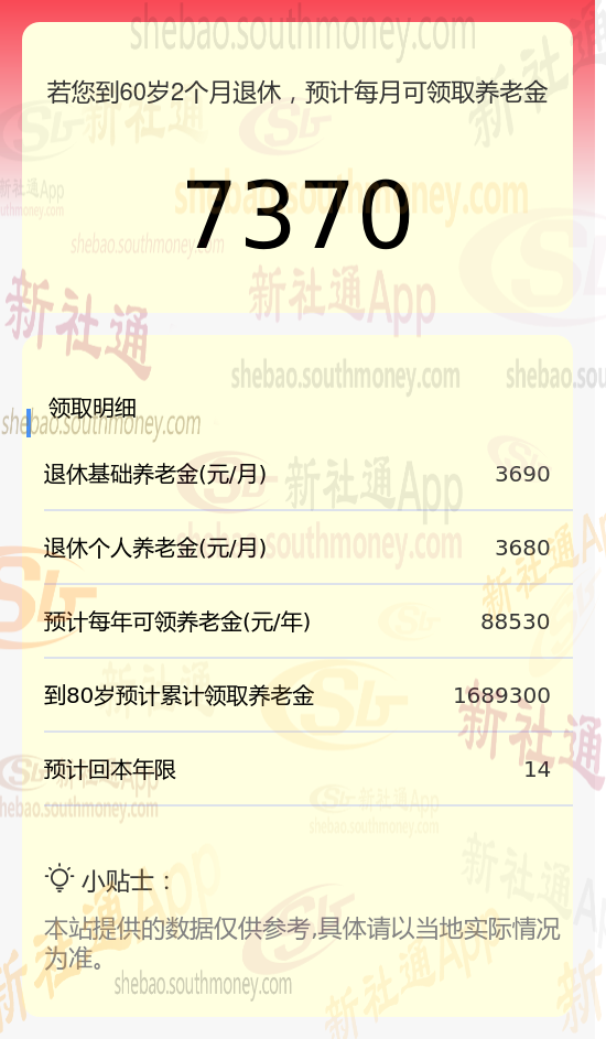 每月可领养老金总额:将基础养老金与个人养老金相加,每月可领取的养老金总额约为7370元(3690元+3680元)。