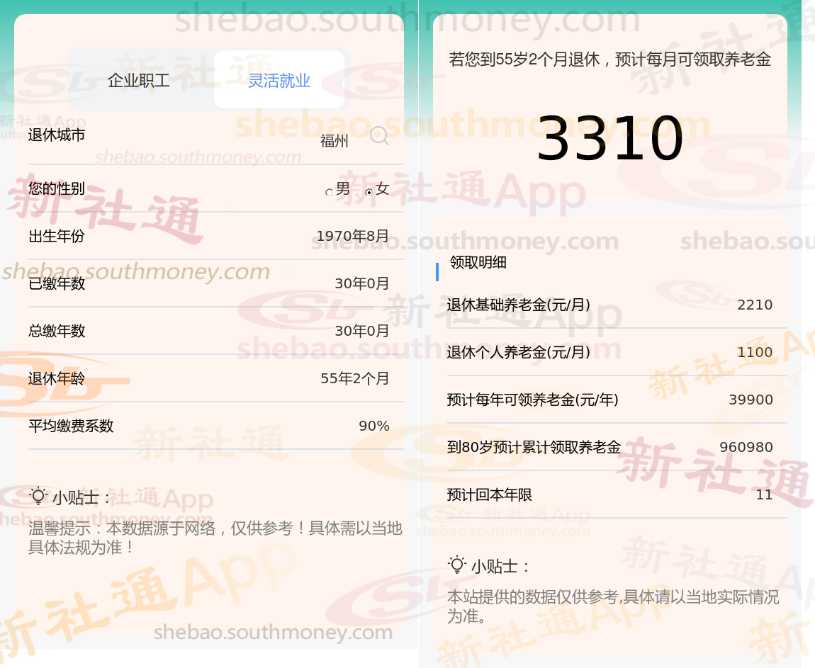 网友孔某退休城市在福州,性别:女,出生年份:1970,总缴年数30年,缴费档次:90%,新社通app养老金计算器所得: