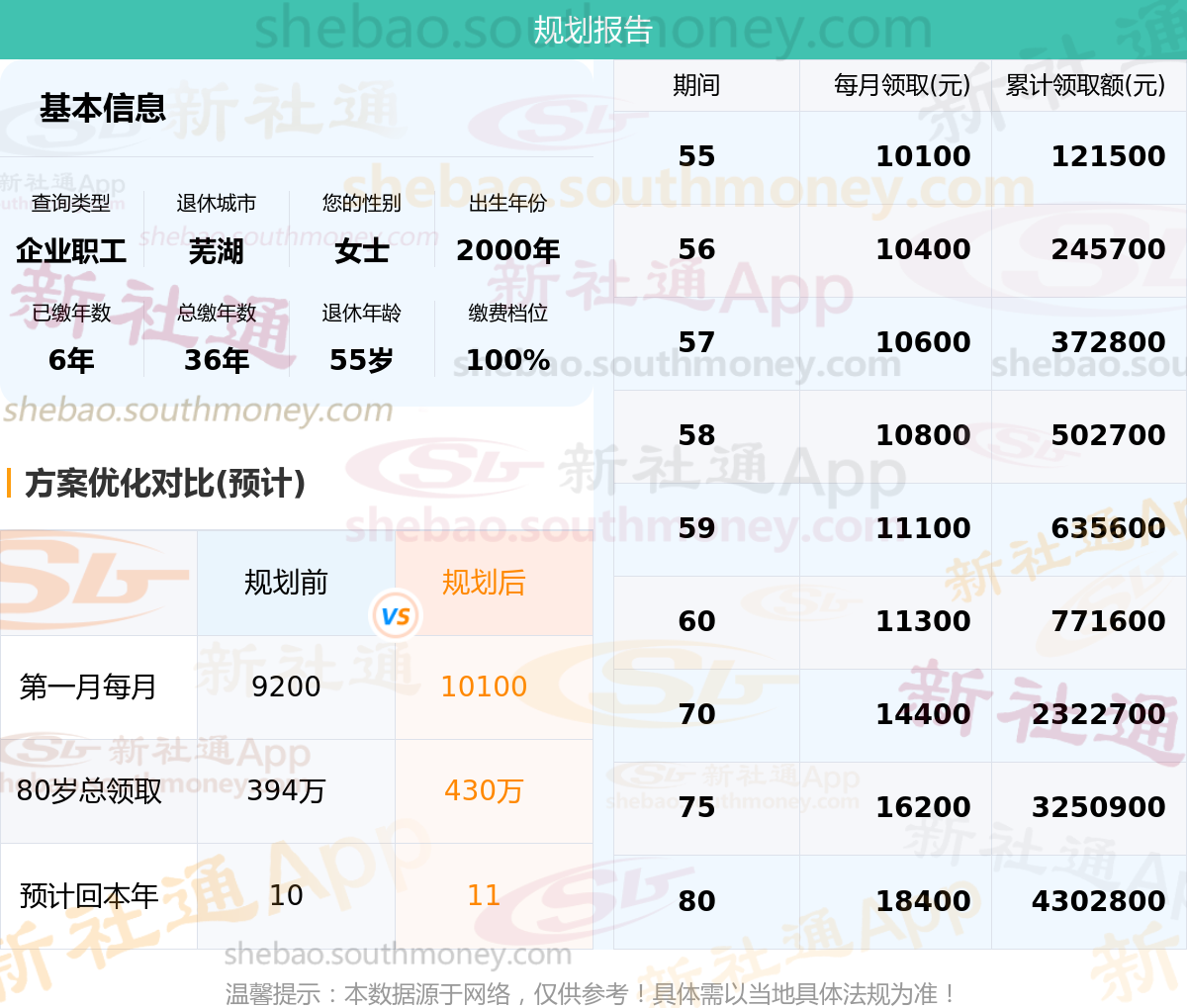 规划前:55岁第一个月约领9200元,新社通APP-养老金规划后:55岁第一个月约领10100元
