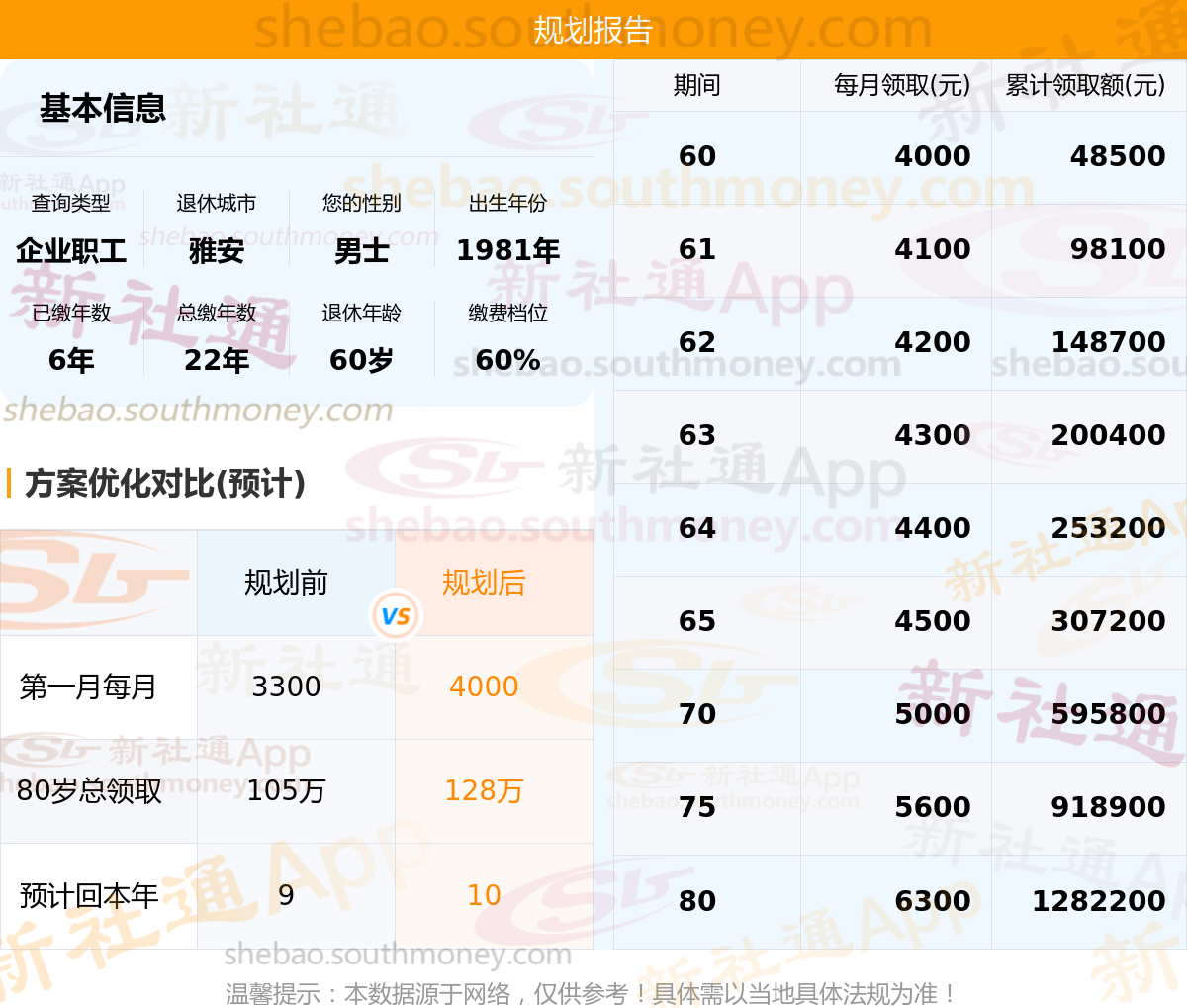 规划前:60岁第一个月约领3300元,新社通APP-养老金规划后:60岁第一个月约领4000元