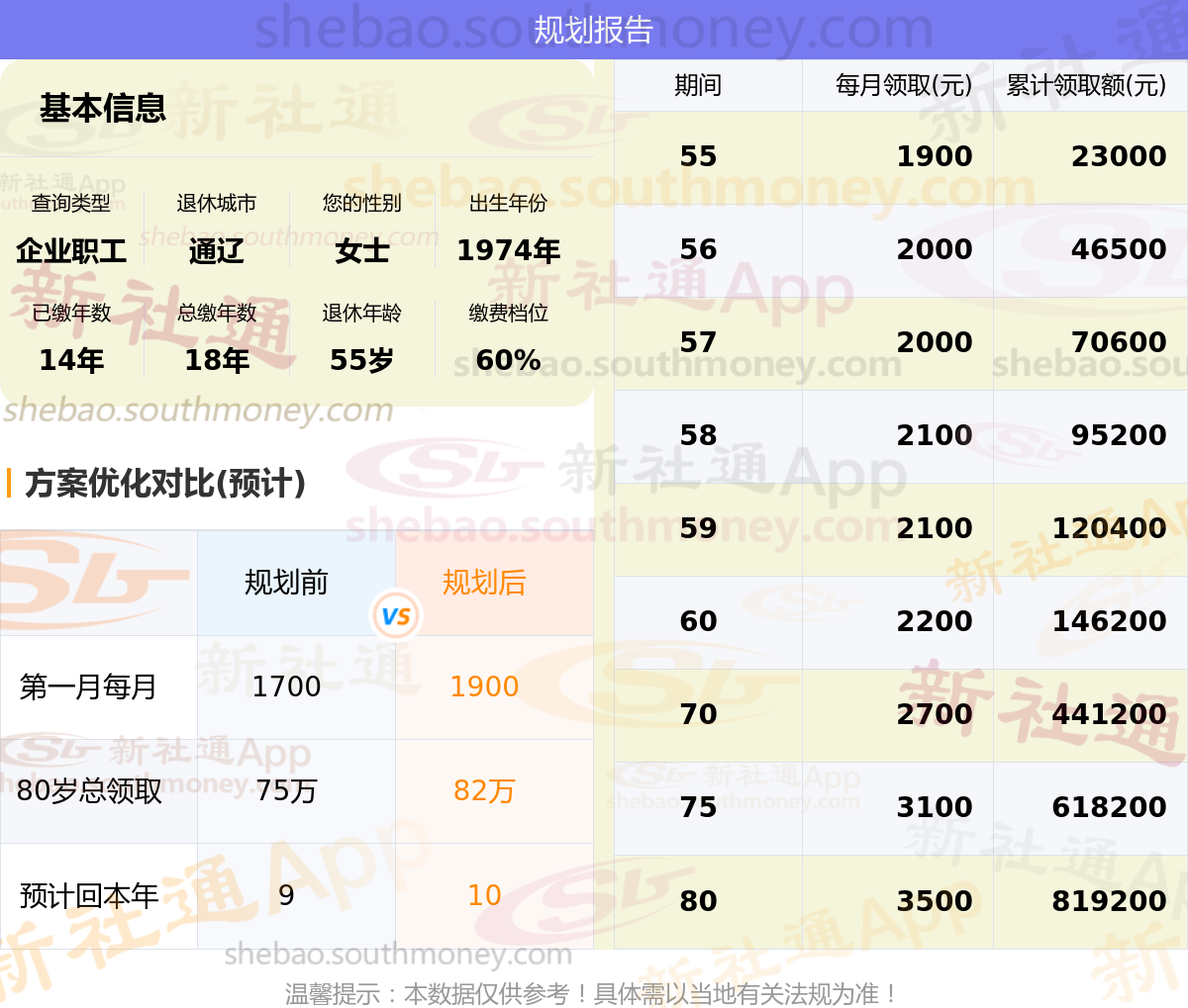 参保城市:通辽,性别:女士,出生年月:1974,已缴年限:14年,总缴年数:18年,退休年龄:55岁,缴费档位:60%。