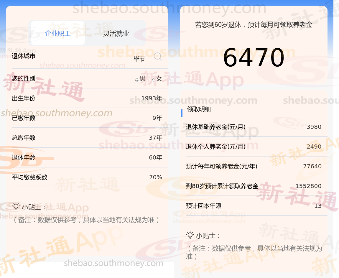 通过新社通APP-养老金计算所得:退休城市、出生年份、退休年龄、缴费系数都相同的情况下,社保缴费年限累计37年时,计算如下: