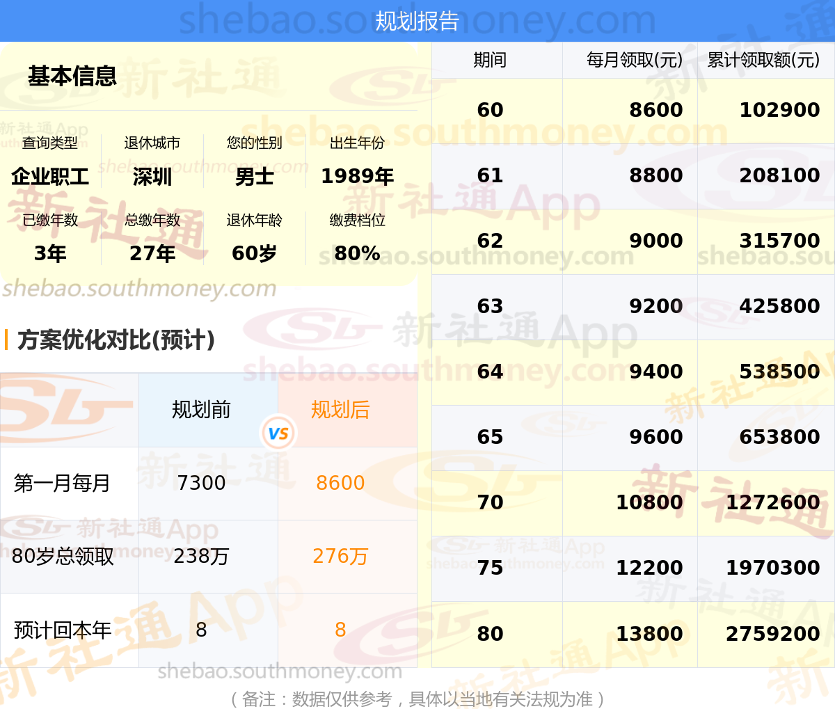 规划前:参保城市:广东深圳,性别:男士,出生年月:1989,已缴年限:3年,总缴年数:27年,退休年龄:60岁,缴费档位:80%。