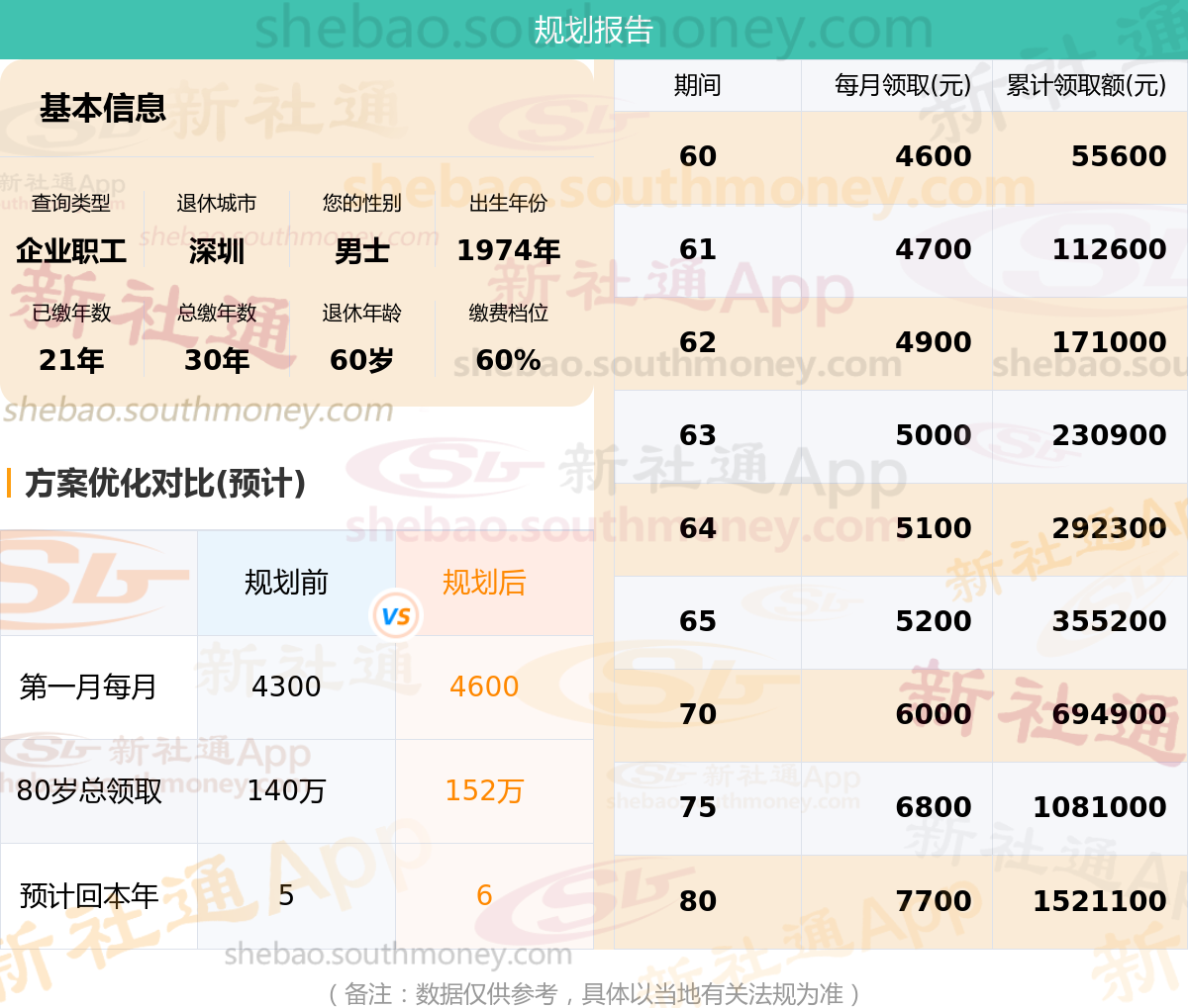 规划前:60岁第一个月约领4300元,新社通APP-养老金规划后:60岁第一个月约领4600元