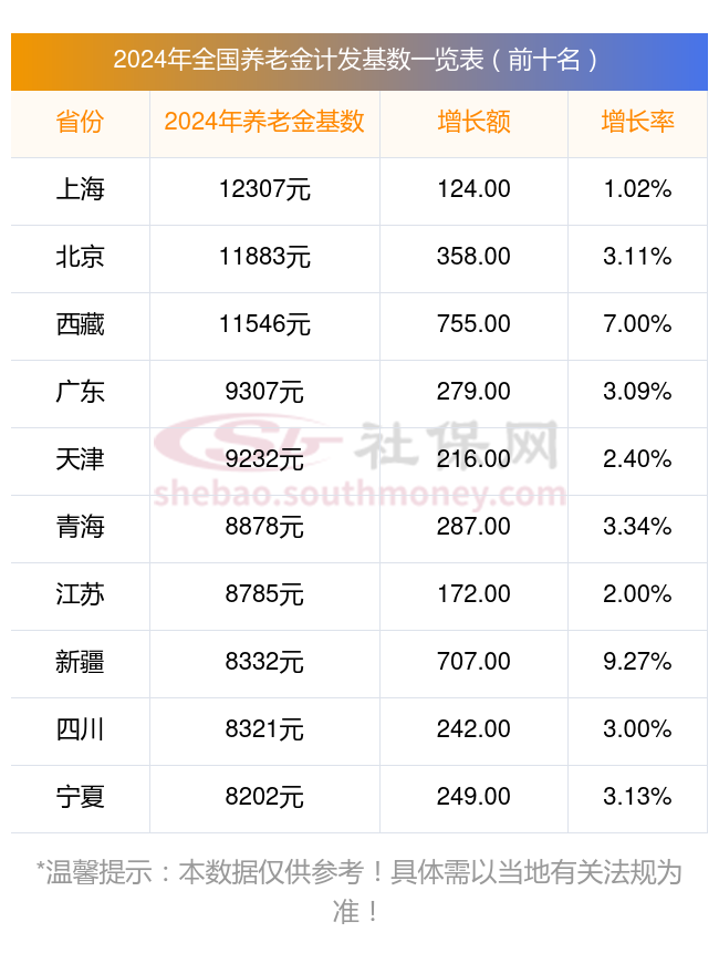 下面看看2023-2024年全国各地养老金计发基数排名前十