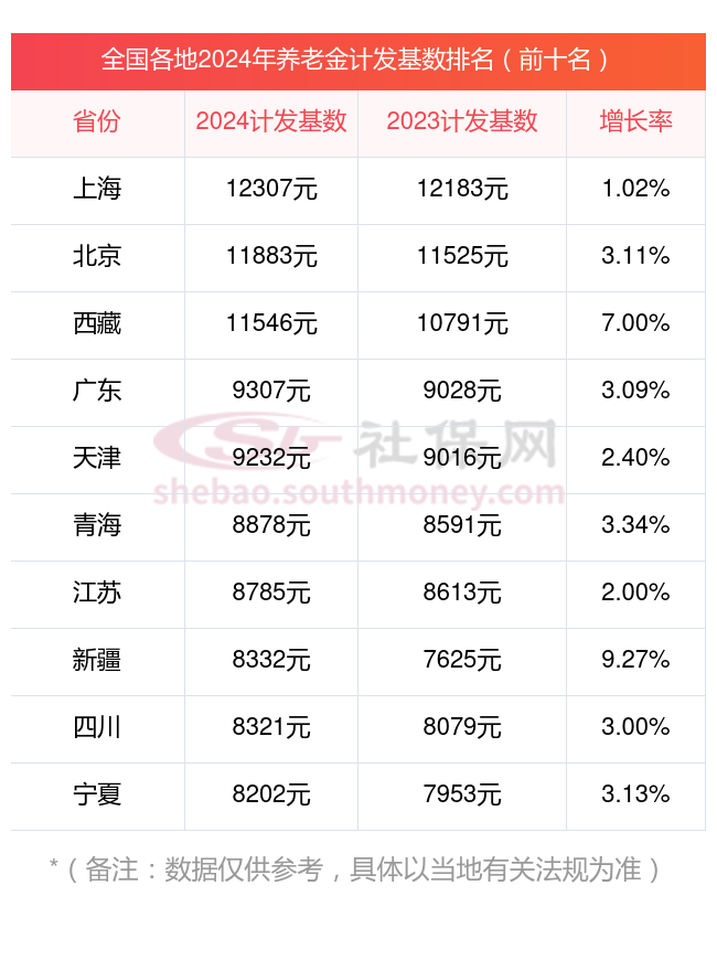 截至目前,2023年全国养老金计发基数排名前十名情况如下
