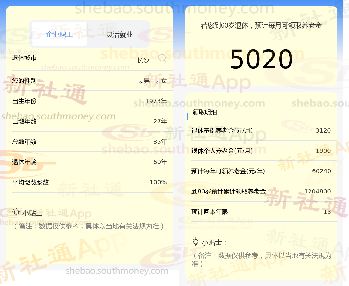 通过新社通APP-养老金计算所得:退休城市、出生年份、退休年龄、缴费系数都相同的情况下,社保缴费年限累计35年时,计算如下: