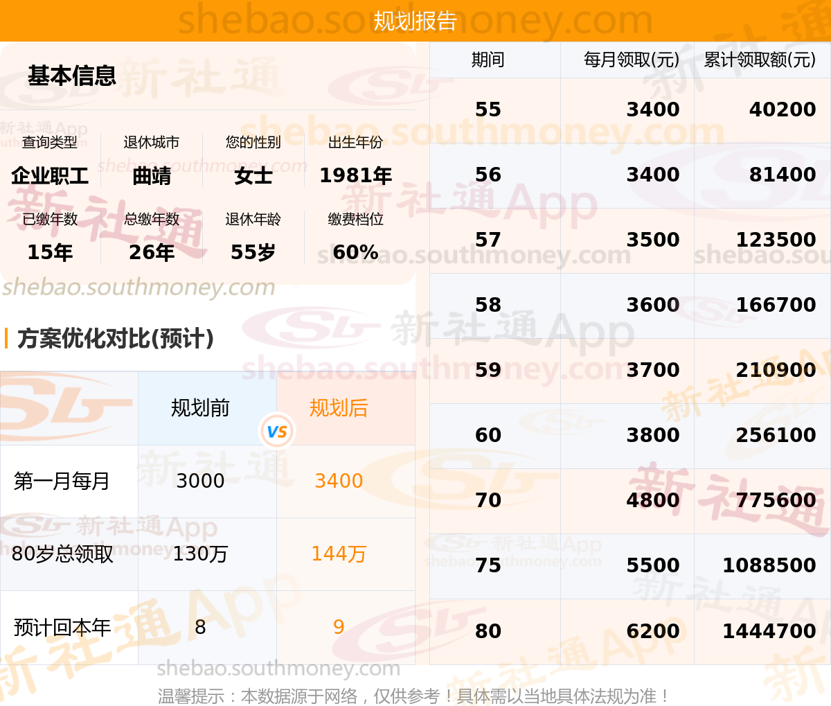 规划前:55岁第一个月约领3000元,新社通APP-养老金规划后:55岁第一个月约领3400元