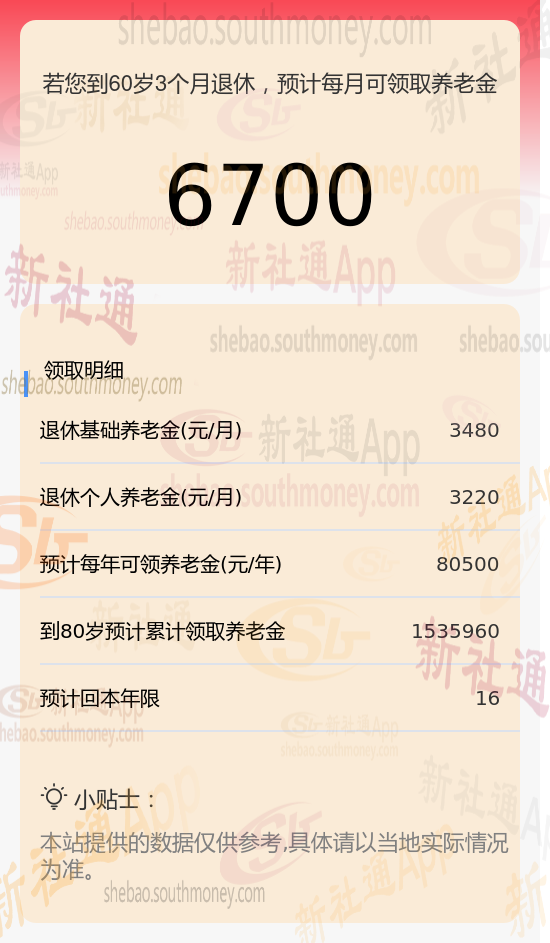 每月可领养老金=基础养老金+个人养老金≈3480+3220≈6700元