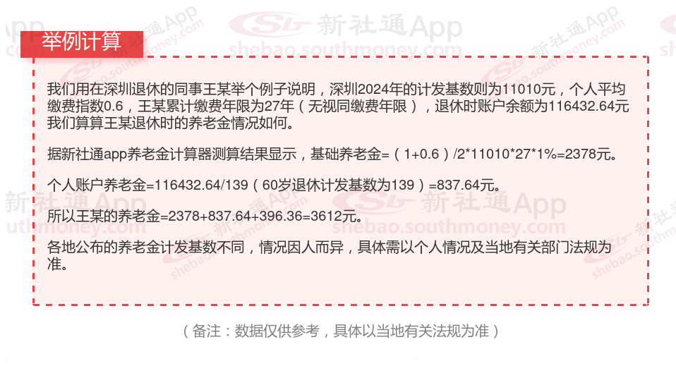 其中,计算公式不相同,我们用在深圳退休网友举个例子说明一下,深圳2024年的计发基数则为11010元,个人平均缴费指数0.6,该网友累计缴费年限为42年(含视同缴费年限8年),退休时账户余额为181117.44元,视同缴费指数为0.6,深圳的过渡性指数为1.20%,我们算算这位网友退休时的养老金情况如何。