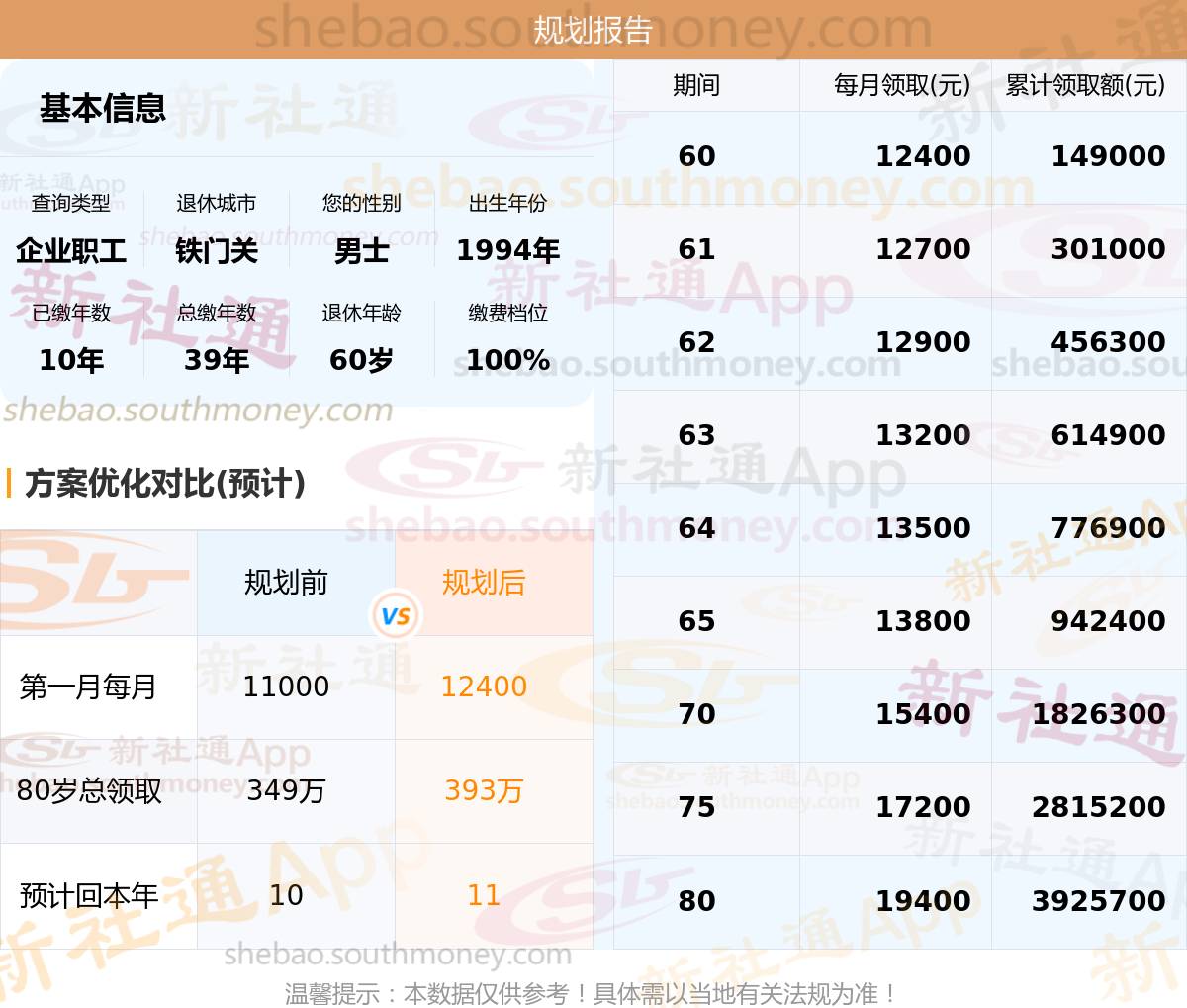 规划前:参保城市:铁门关,性别:男士,出生年月:1994,已缴年限:10年,总缴年数:39年,退休年龄:60岁,缴费档位:100%。