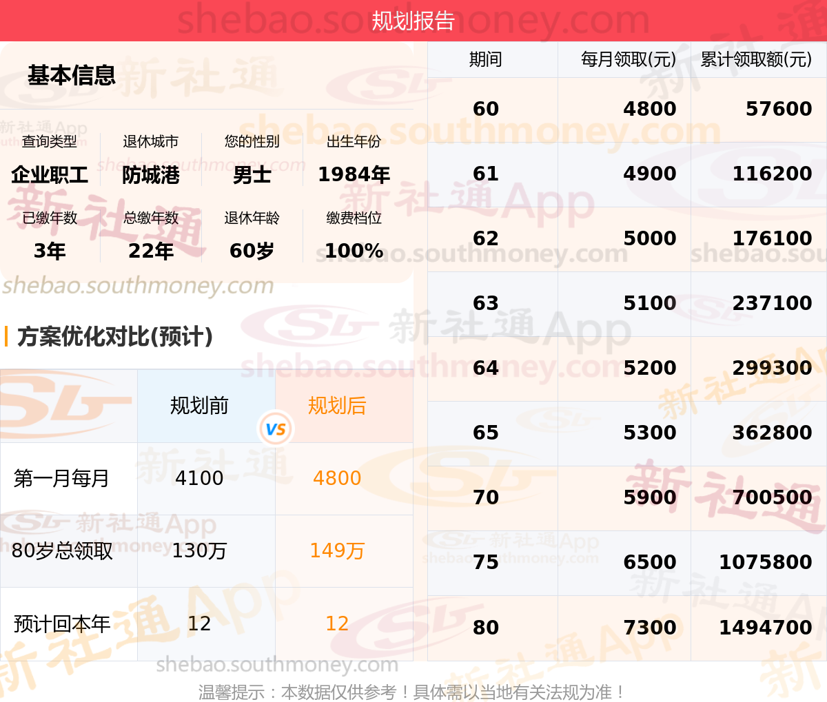 规划前:参保城市:防城港,性别:男士,出生年月:1984,已缴年限:3年,总缴年数:22年,退休年龄:60岁,缴费档位:100%。