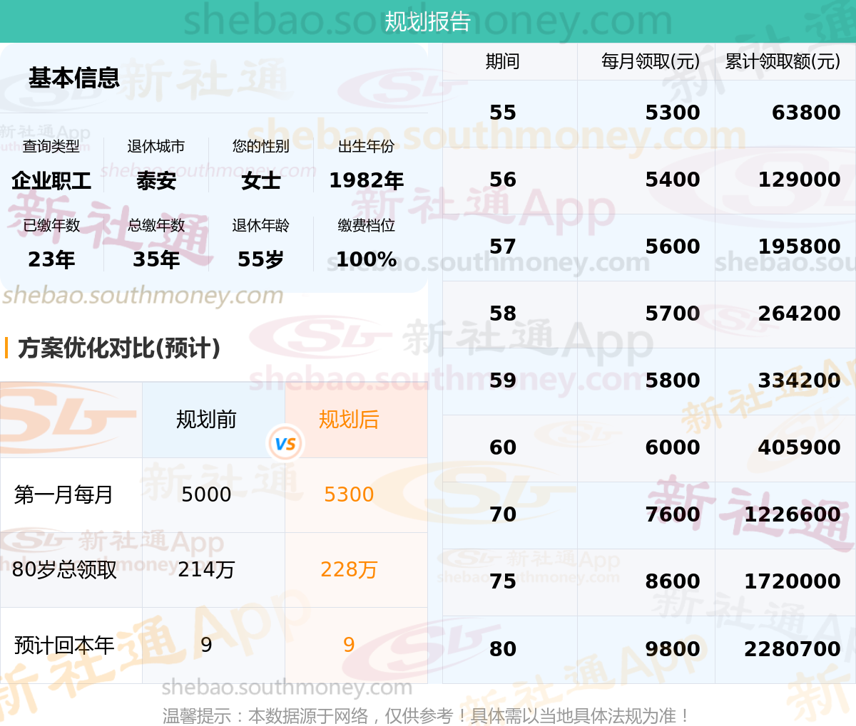 居住城市:泰安,性别:女士,出生年月:1982,已缴年限:23年,总缴年数:35年,退休年龄:55岁,缴费档位:100%。