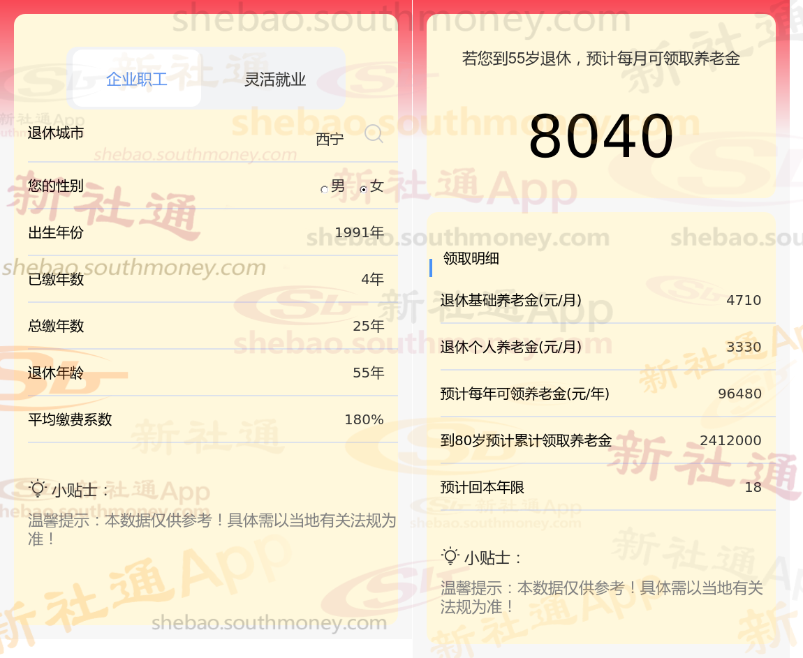 通过新社通APP-养老金计算所得:退休城市、出生年份、退休年龄、缴费系数都相同的情况下,社保缴费年限累计25年时,计算如下: