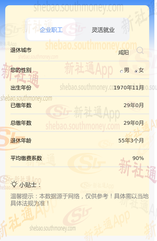 退休城市:咸阳,性别:女,出生年份:1970,总缴年数29年,缴费档次:90%