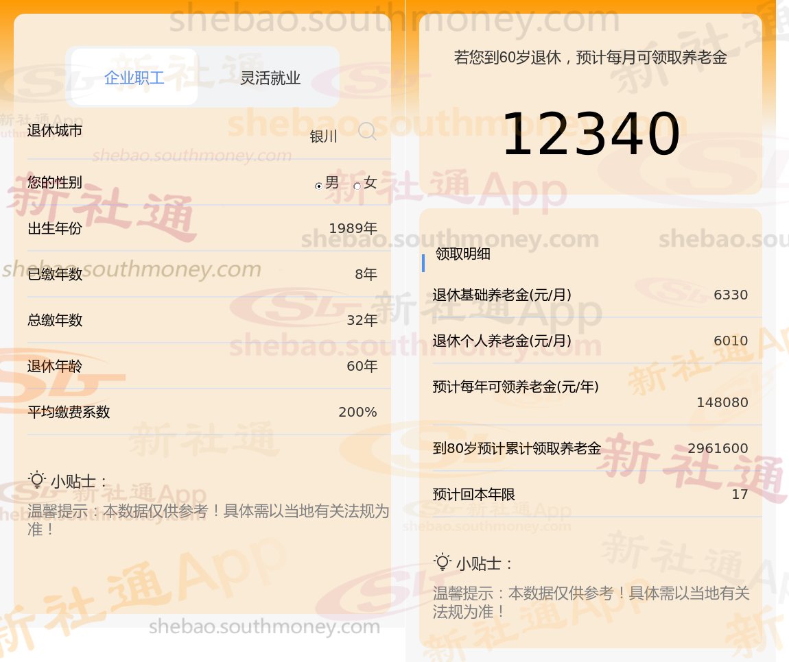 通过新社通APP-养老金计算所得:退休城市、出生年份、退休年龄、缴费系数都相同的情况下,社保缴费年限累计32年时,计算如下: