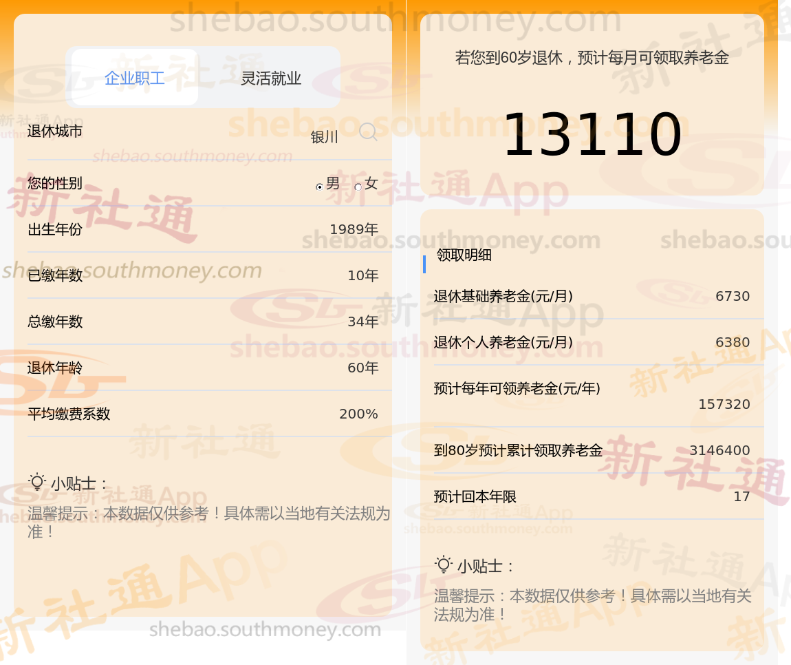 通过新社通APP-养老金计算所得:退休城市、出生年份、退休年龄、缴费系数都相同的情况下,社保缴费年限累计34年时,计算如下: