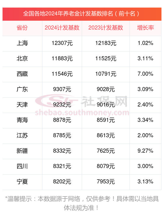 据了解,全国各省均呈上涨趋势。以下是2023年全国31省的养老金计发基数前十名