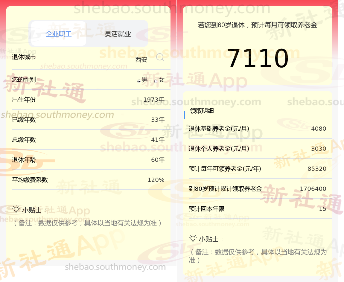 通过新社通APP-养老金计算所得:退休城市、出生年份、退休年龄、缴费系数都相同的情况下,社保缴费年限累计41年时,计算如下:
