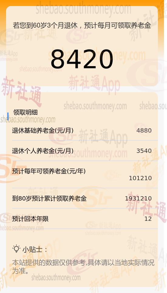 总养老金月度领取额:将基础养老金和个人养老金相加,得出每月可领取的养老金总额大约为8420元(即4880元基础养老金+3540元个人养老金)。