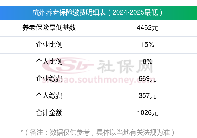 据新社通app显示,杭州职工养老保险最低缴费基数为:4462元;单位和个人的缴费比例分别为:15%、8%;
