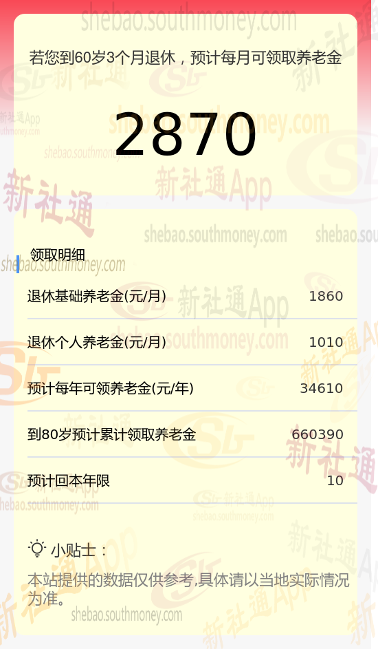 社保按60%档次缴费的张某,新疆乌鲁木齐城市退休,出生于1965年,工龄28年,男性。岁月流转,他终于迎来了自己的退休年龄。根据新社通app养老金在线计算器计算所得: