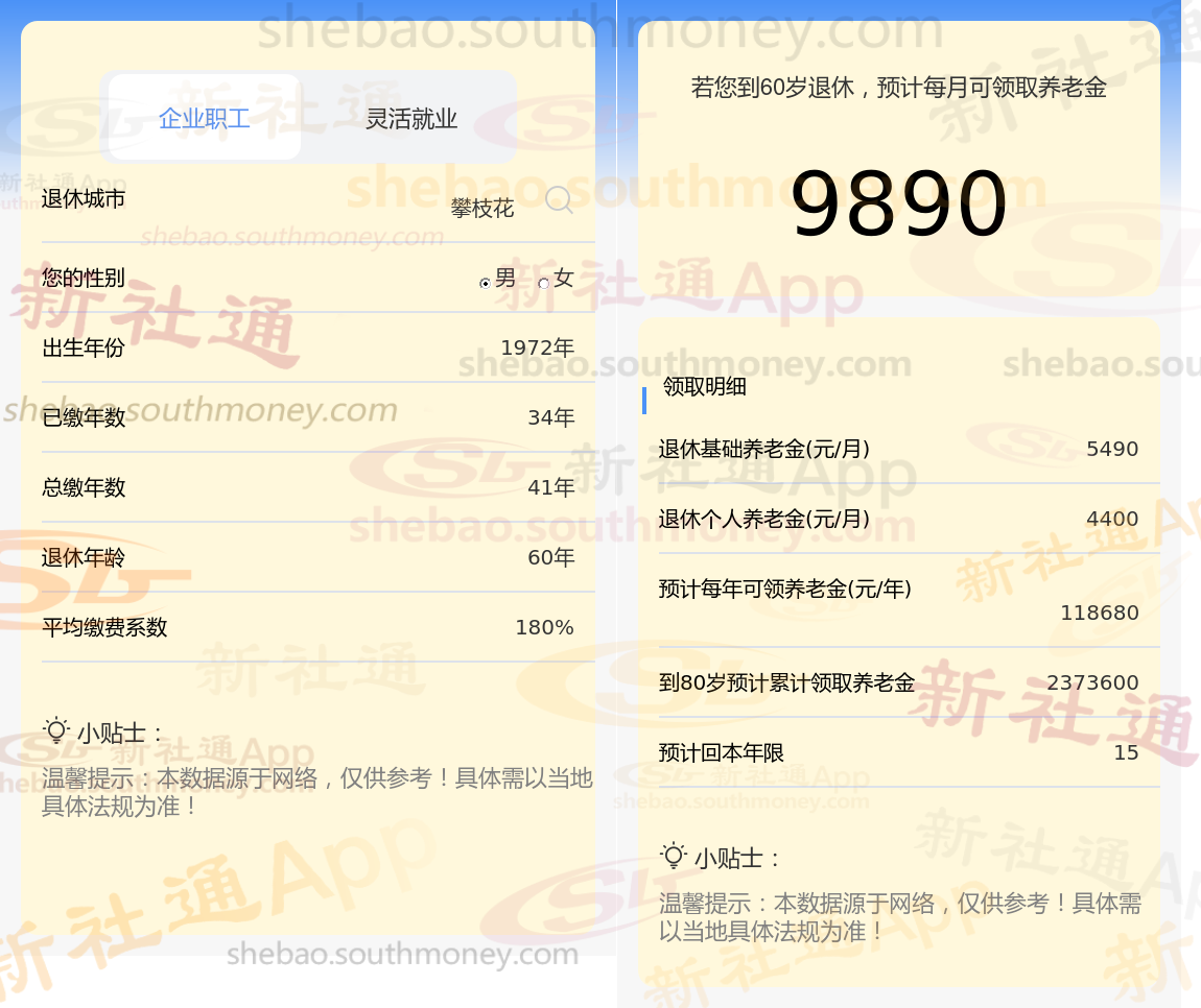 通过新社通APP-养老金计算所得:退休城市、出生年份、退休年龄、缴费系数都相同的情况下,社保缴费年限累计41年时,计算如下: