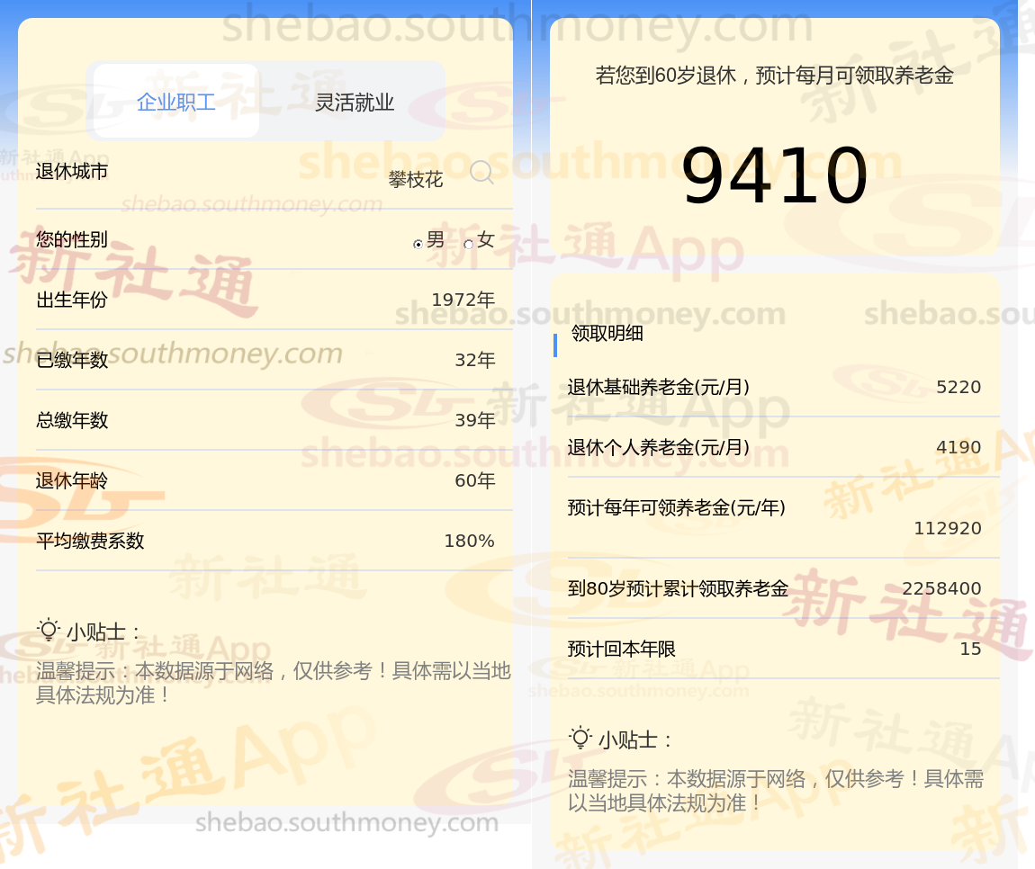 通过新社通APP-养老金计算所得:退休城市、出生年份、退休年龄、缴费系数都相同的情况下,社保缴费年限累计39年时,计算如下: