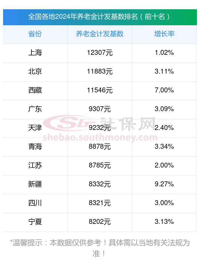 2024年新疆养老金计发基数增长率达到9.27%,位列第一位;