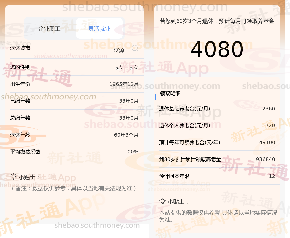 退休城市:辽源,性别:男,出生年份:1965,总缴年数33年,缴费档次:100%,新社通app养老金计算器所得: