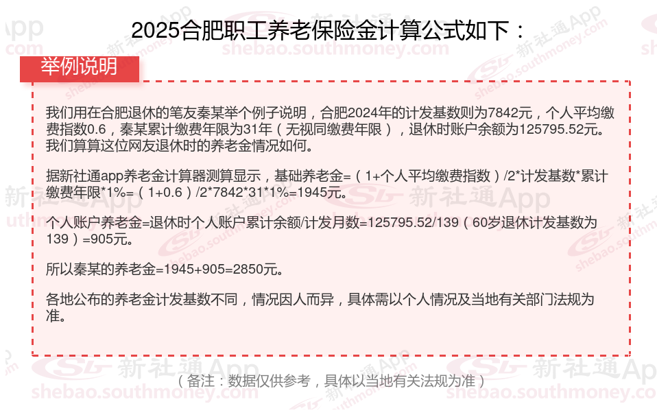 1、基础养老金计算公式=合肥养老金计发基数×(1+平均缴费指数)÷2×缴费年限×1%。