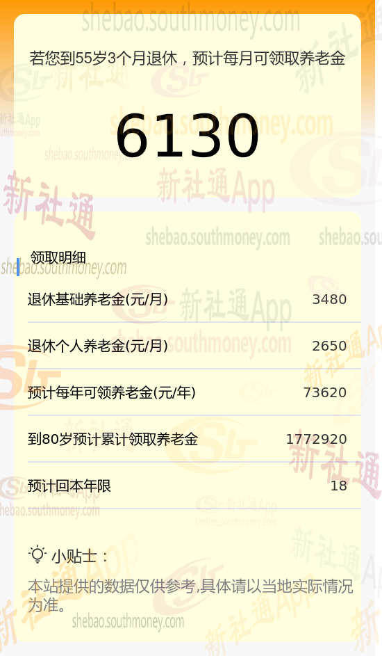 每月可领养老金=基础养老金+个人养老金≈3480+2650≈6130元