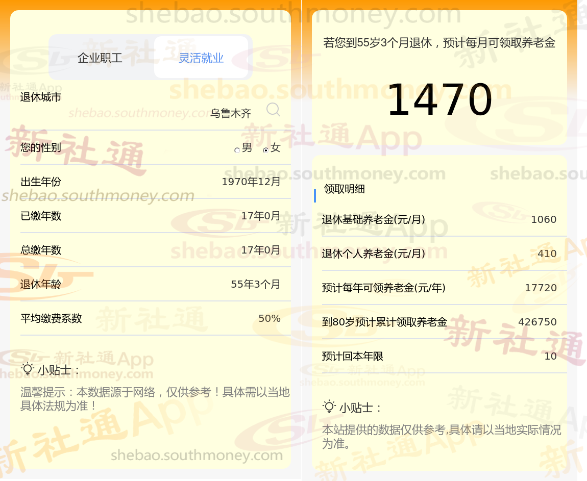 网友朱某退休城市在乌鲁木齐,性别:女,出生年份:1970,总缴年数17年,缴费档次:50%,新社通app养老金计算器所得: