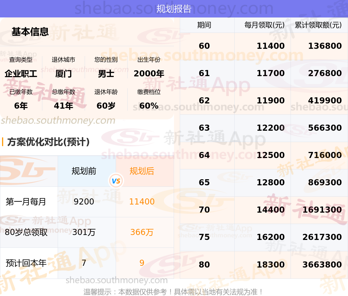 规划前:60岁第一个月约领9200元,新社通APP-养老金规划后:60岁第一个月约领11400元