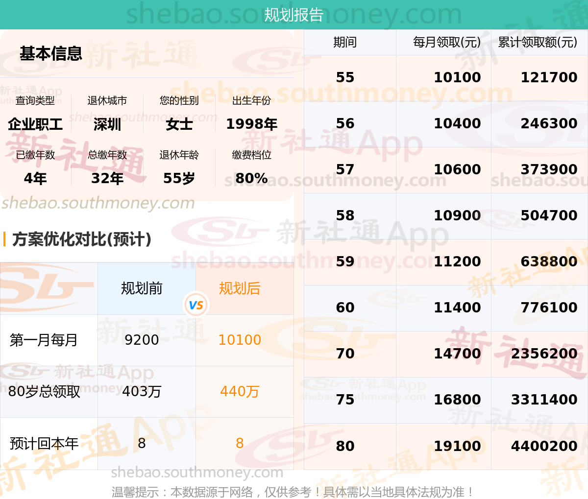规划前:55岁第一个月约领9200元,新社通APP-养老金规划后:55岁第一个月约领10100元