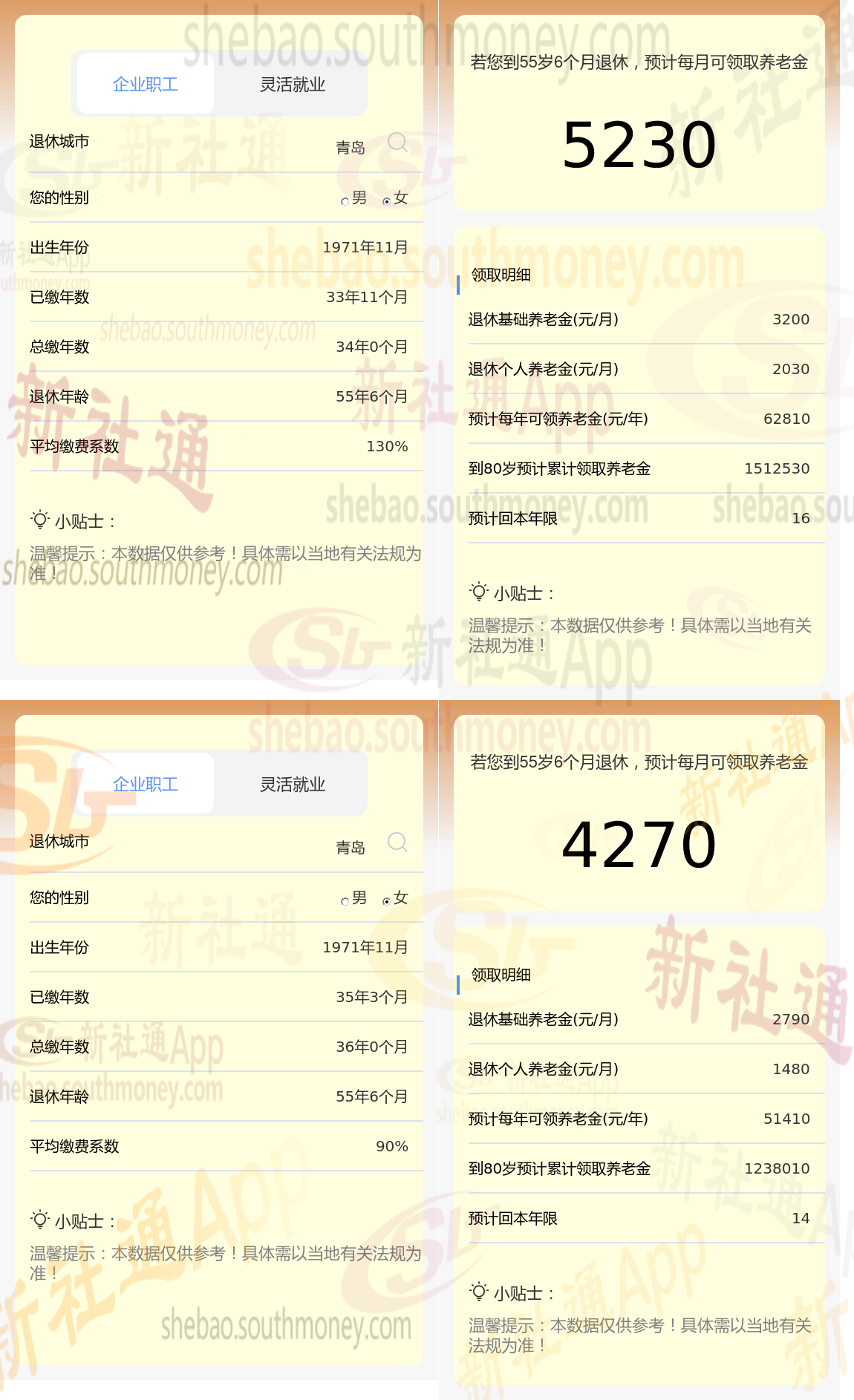 新社通app养老金计算器,轻松测算您的养老金!:吕某与老郑的差别,缴费年限、缴费档位不同的情况下,差别5230-4270=960元。通过选择提高缴费档位及拉长缴费年限,都可以为未来的退休生活奠定更加坚实的经济基础。当然增加缴费金额意味着在现有缴费标准上选择更高的档次进行缴纳,这样做能够积累更多的个人账户资金,并在达到法定退休年龄时,根据‘多缴多得’的原则,领取到更为丰厚的退休金。这是一种前瞻性的规划方式,旨在确保您的退休生活品质,让您能够享受更加宽裕、安心的晚年时光。