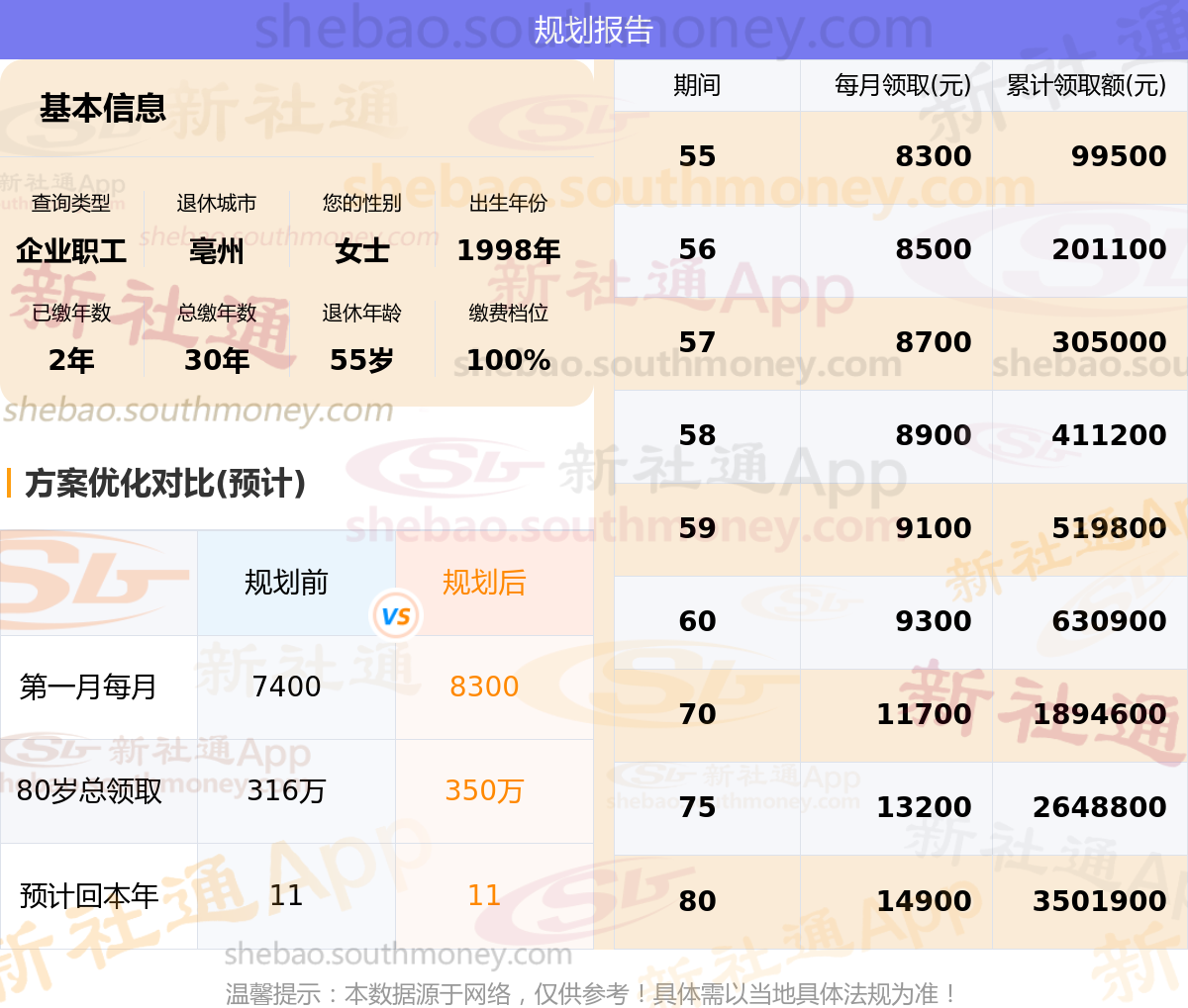 规划前:参保城市:安徽亳州,性别:女士,出生年月:1998,已缴年限:2年,总缴年数:30年,退休年龄:55岁,缴费档位:100%。