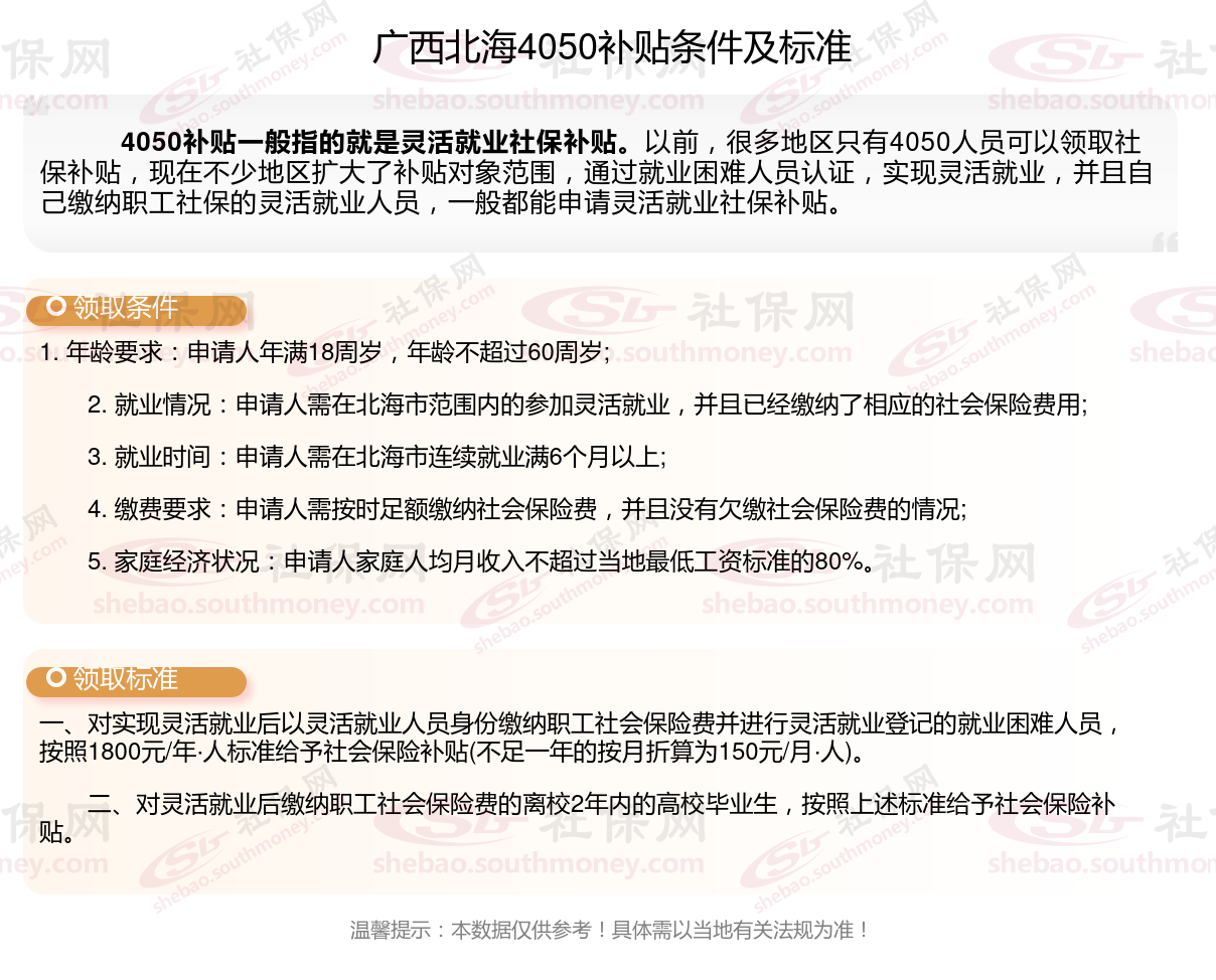 2024广西北海灵活就业4050社保补贴是一项面向特定年龄段的就业困难人群的社会保险补贴。